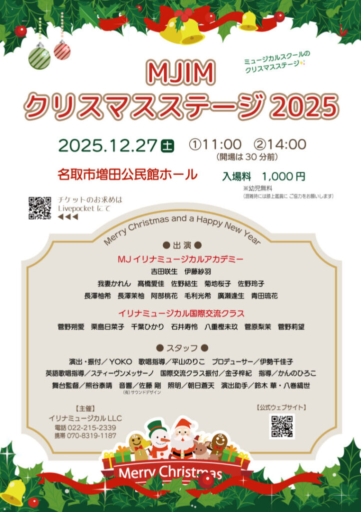 2025.11.22 |MJIMブログ MJIMクリスマスステージ2025 チケットはこちら(Livepocketサイトへリンク) MJIMクリスマスステージ202512月27日(土) 名取市増田公民館ホール時間 ①11:00 ②14:00チケット料金 1,000円(幼児無料)混雑時は大人の膝上での鑑賞にご協力願います。全席自由 ご来場をお待ちしています‼️ 稽古の様子1 稽古の様子2 稽古の様子3 前ページ INFO一覧へ戻る Category MJIMブログ インフォメーション 舞台公演情報 体験レッスン 出演情報 生徒の声 ゲスト講師 ライセンスコーディネート New Article 2025.11.22 MJIMクリスマスステージ2025 2024.09.03 ミュージカル「おさるのジョージ」稽古進行中 2024.08.09 ミュージカル「おさるのジョージ」 2024.06.17 YouTubeCM放送中です! 2024.01.14 ミュージカルに出演した生徒の声|仙台・名取のミュージカルスクール